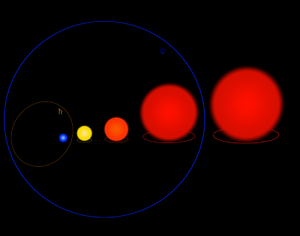 A radius of 2,150 R☉ (1.50×109 km; 10.0 astronomical unit|au; 930,000,000 mi) was derived from a bolometric luminosity of nearly 440,000 L☉ and an estimated effective temperature of 3,200 K, which is considerably larger than theoretical models of the largest red supergiants predicted by stellar evolutionary theory (around 1,500 R☉).[16][7] Assuming this value is correct, this would make it larger than other famous red supergiants, such as Antares A, Betelgeuse, VY Canis Majoris and UY Scuti.