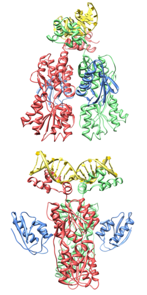 - ↑ 1.0 1.1 1.2 Schumacher, M. A.; Allen, G. S.; Diel, M.; Seidel, G.; Hillen, W.; Brennan, R. G. (2004). "Structural Basis for Allosteric Control of the Transcription Regulator CcpA by the Phosphoprotein HPr-Ser46-P". Cell 118 (6): 731–741. doi:10.1016/j.cell.2004.08.027. PMID 15369672.