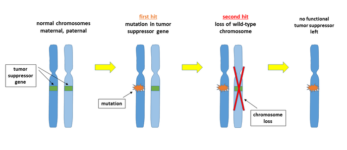 In the first hit, the tumor suppressor gene on one of the two chromosomes is affected by a mutation that makes the gene product non-functional. This mutation may arise spontaneously as a DNA replication error or may be induced by a DNA damaging agent. The second hit removes the remaining wild-type chromosome, for example through a mitotic nondisjunction event. There are several other potential mechanisms for each of the two steps, for example an additional mutation, an unbalanced translocation, or a gene deletion by recombination. As a result of the double lesion, the cell may become malignant because it is no longer able to express the tumor suppressor protein.