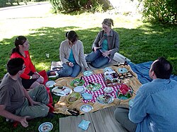 - Picnic – outdoor meal where one brings one's food, such as a sandwich or a prepared meal (sometimes in a picnic basket). It often takes place in a natural or recreational area, such as a park, forest, beach, or lawn. On long drives a picnic may take place at a roadside stop such as a rest area. Picnics are often consumed on a picnic table.