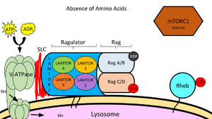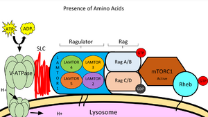 While the intricate functions of the Ragulator-Rag Complex are not fully understood, it is known that the Ragulator-Rag Complex associates with the lysosome and plays a key role in mTOR (mammalian target of rapamycin) signaling regulation.[10] mTOR signaling is sensitive to amino acid concentrations in the cytoplasm of the cell, and the Ragulator complex works to detect amino acid concentration and transmit signals that activate, or inhibit, mTORC1.[11]