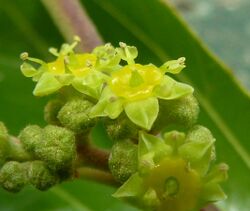 The family contains about 55 genera and 950 species.[5] The Rhamnaceae have a worldwide distribution, but are more common in the subtropical and tropical regions. The earliest fossil evidence of Rhamnaceae is from the Late Cretaceous. Fossil flowers have been collected from the Upper Cretaceous of Mexico and the Paleocene of Argentina.[6]