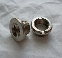 - The cranks are pressed into place and prevented from squirming off via fretting by a bolt or nut installed into or onto the bottom bracket spindle.[5] The head of the bolt or the nut sits inside a counterbore that is also threaded to accept a crank puller tool. The counterbore is often covered with a dust cover.