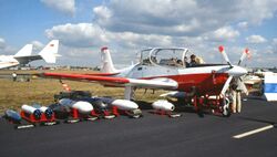 High manoeuvrability, stability at low speeds, and four underwing pylons providing for up to 1,000 kg (2,200 lb) of ordnance, allow the training aircraft to engage in tactical bombing campaigns in low-intensity conflict or counterinsurgency environments and in counternarcotics interceptions.[42] The type can carry up to 694 litres (183 US gal) of fuel internally;[43] additionally, two fuel tanks of 660 litres (170 US gal) can be fitted to underwing weapon stations for extended endurance,[9] enabling up to nine flight hours.[44]