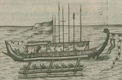 According to the same manuscript, in Maluku there are many types of ships, the most important of which is called the juanga, which resembles a royal galley (guales reaes). There are also other ships called lakafuru, kora-kora, kalulus, and small boats. Each of them is driven by oars and is not used for carrying loads, the space is long but not deep, a juanga can carry 200 oars per hull side, plus nearly 100 Script error: The function "transl" does not exist. men (Script error: The function "transl" does not exist.). However, there are also smaller juanga carrying only 150 paddlers per side and 50 people on Balieo, some are even smaller.[3] Usually juanga, lakafuru, and kora-kora carried 1–3 boats, but in case of danger these boats may be discarded onto the sea.[15]
