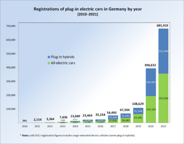 - ↑ 17.0 17.1 17.2 17.3 Kraftfahrt-Bundesamtes (KBA) (2021-01-06). "Pressemitteilung Nr. 01/2021 - Elektromobilität in Deutschland auf der Überholspur" (in de). KBA. https://www.kba.de/DE/Presse/Pressemitteilungen/2021/Allgemein/pm01_2021_E_Antrieb.html?nn=646300. "In the case of cars with electric drive, this positive development was even more pronounced at +147.1 percent - here the share of the total stock rose from 0.5 percent to 1.2 percent (Translated from the original)" The term electric drive used by KBA includes battery-electric, plug-in and fuel-cell cars.