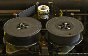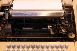 The printing mechanism is usually geared to run at a maximum ten characters per second speed, or 100 words per minute (wpm), but other slower speeds were available: 60 wpm, 66 wpm, 68.2 wpm, and 75 wpm.[12] There are also many typefont options. The Teletype Parts Bulletin[13] listed 69 available Model 33 type element factory-installed options (frequent type element changes in the field were impractical). The type element, called a "typewheel" in Teletype's technical manuals, is cylindrical, with characters arranged in four tiers, 16 characters per tier, and thus is capable of printing 64 characters. The character to be printed is selected by rotating the typewheel clockwise or anticlockwise and raising or lowering it, then striking the typewheel with a padded hammer, which impacts the element against the ink ribbon and paper.[14]