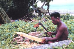 - Satawal islander building a canoe