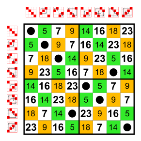 Group table of D4 e r1 r2 r3 fv fh fd fc e e r1 r2 r3 fv fh fd fc r1 r1 r2 r3 e fc fd fv fh r2 r2 r3 e r1 fh fv fc fd r3 r3 e r1 r2 fd fc fh fv fv fv fd fh fc e r2 r1 r3 fh fh fc fv fd r2 e r3 r1 fd fd fh fc fv r3 r1 e r2 fc fc fv fd fh r1 r3 r2 e The elements e, r1, r2, and r3 form a subgroup, highlighted in red (upper left region). A left and right coset of this subgroup is highlighted in green (in the last row) and yellow (last column), respectively.
