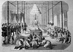King Mongkut and Chaophraya Si Suriyawong realized that, due to the geopolitical situation, Siam could stand no more against British demands for concessions. Sir John Bowring the Governor of Hong Kong, who was the representative of the British government in London (rather than East India Company),[11] arrived at Bangkok in 1855.[44] The Bowring Treaty was signed in April 1855,[44][36] in which tariffs were reduced and standardized to three percent[11] and the Phasi Pak Ruea (measurement duties) was abolished.[43] The treaty granted extraterritoriality to the British in Siam,[36] who would be subject to a British consular authority and British law instead of traditional Siamese inquisition, as Westerners sought to dissociate themselves from Siamese Nakhonban methods of judiciary tortures. The treaty also stipulated the establishment of a British consulate in Bangkok. The Bowring Treaty was followed by similar 'unequal treaties' with other Western nations including the United States (Townsend Harris, May 1856),[45] France (Charles de Montigny, August 1856), Denmark (1858),[46] Portugal (1858), the Netherlands (1860) and Prussia (Eulenberg, 1861),[47] all of which Prince Wongsathirat Sanit, Mongkut's younger half-brother and Chaophraya Si Suriyawong (called 'Kalahom' in Western sources) were the main negotiators. King Mongkut also declared freedom of religion to his subjects in 1858.[48]