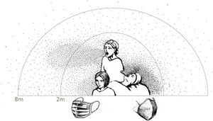 Coughs and sneezes can spread airborne droplets up to ~8 meters (26 ft). Speaking can spread droplets up to ~2 meters (6.6 ft).[6] It may be difficult to maintain these distances. For a masked person, or even one sneezing or coughing into a tissue or elbow, these distances are reduced.[8]