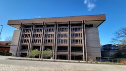 Syracuse University's main library is the E. S. Bird Library, which opened in September 1972.[77][78] Its seven levels contain 2.3 million books, 11,500 periodicals, 45,000 feet (14,000 m) of manuscripts and rare books, 3.6 million microforms, and a café. It remains one of the hundred largest libraries in the country.[79] The historic Carnegie library houses Science and Technology collection, additionally serving as a reading room.[20] There are also several departmental libraries on campus. Many of the landmarks in the history of recorded communication between people are in the university's Special Collections Research Center, from cuneiform tablets and papyri to several codices dating from the 11th century to the invention of printing. The collection also includes works by Galileo, Luther, John Calvin, Voltaire, Isaac Newton, Descartes, Francis Bacon, Samuel Johnson, Thomas Hobbes, Goethe, and others. Other collections of note include Rudyard Kipling first editions and an original second leaf of the Gutenberg Bible.