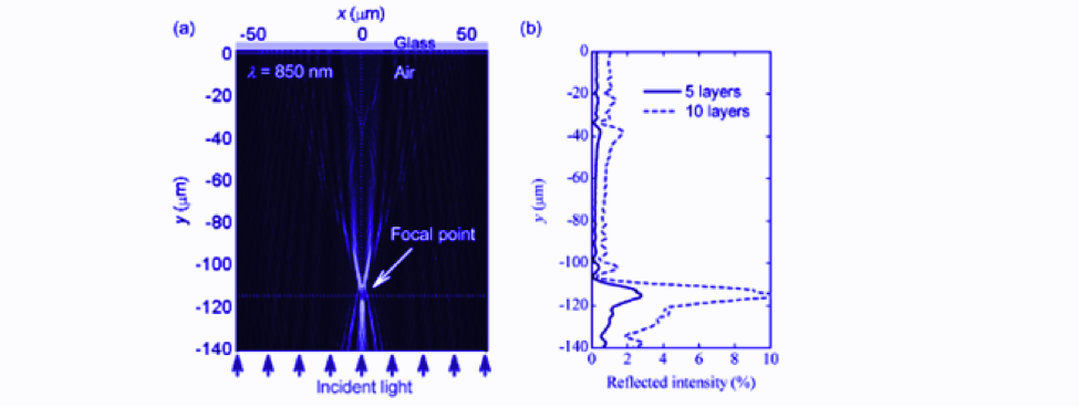 Despite its weak reflectance (R = 0.25π2 α 2 at T = 1.3 × 10−4 K), graphene has utility as a lens for Fresnel zone plates.[13] Graphene lenses effectively concentrate light of ʎ = 850 nm onto a single point 120 μm away from the Fresnel zone plate[13] (Figure 5). Further investigation illustrates that the reflected intensity increases linearly with the number of graphene layers within the lens[13] (Figure 6).