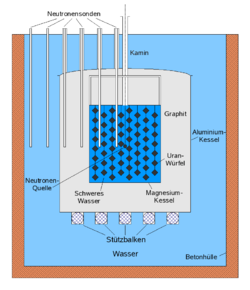 - ↑ 1.0 1.1 1.2 W. Heisenberg, K. Wirtz:Large-scale tests in preparation for the construction of a uranium burner. In: Naturforschung und Medizin in Deutschland 1939–1946. Für Deutschland bestimmte Ausgabe der FIAT Review of German Science, Vol. 14 Part II (ed. W. Bothe and S. Flügge), Wiesbaden: Dieterich. Also reprinted in: Stadt Haigerloch (ed.): Atommuseum Haigerloch, Self-published, 1982, pp. 43-65.