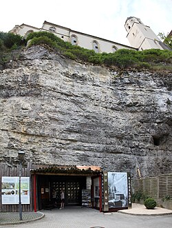 As early as July 29, 1944, the accidentally discovered potato and beer cellar of the Haigerloch Schwanenwirt was rented for 100 Reichsmark per month as the new location of the Berlin research reactor.[5] The Felsenkeller (rock cellar) was built at the beginning of the 20th century for a tunnel for the Hohenzollerische Landesbahn.[6] In the narrow Eyachtal valley, it was driven into the mountain under the Schlosskirche (castle church) there and protected against bomb attacks by a 20–30 m thick layer of rock made of shell limestone.[7]