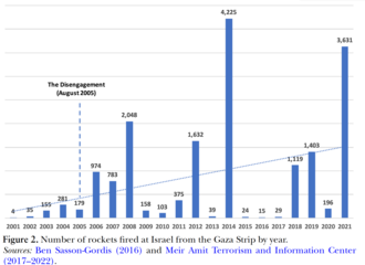 In 2006, a Hezbollah artillery assault on Israel's northern border communities and a cross-border abduction of two Israeli soldiers precipitated the month-long Second Lebanon War.[277][278] In 2007, the Israeli Air Force destroyed a nuclear reactor in Syria. In 2008, a ceasefire between Hamas and Israel collapsed. The 2008–2009 Gaza War lasted three weeks and ended after Israel announced a unilateral ceasefire.[279][280] Hamas announced its own ceasefire, with its own conditions of complete withdrawal and opening of border crossings. Despite neither the rocket launchings nor Israeli retaliatory strikes having completely stopped, the fragile ceasefire remained.[281] In what Israel described as a response to more than a hundred Palestinian rocket attacks on southern Israeli cities,[282] Israel began an operation in the Gaza Strip in 2012, lasting eight days.[283] Israel started another operation in Gaza following an escalation of rocket attacks by Hamas in July 2014.[284] In May 2021, another round of fighting took place in Gaza and Israel, lasting eleven days.[285]