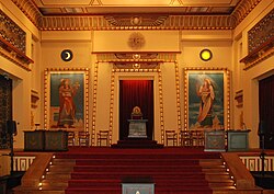 At the conclusion of the meeting, the Lodge may hold a formal dinner, called Agape[26] or festive board, sometimes involving toasting and song.[27] These meetings are typically held in a Masonic temple, though other venues may occasionally be used.