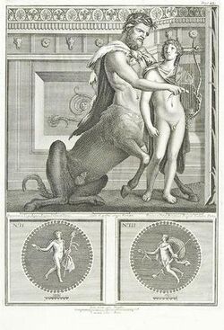 Images within each volume are grouped by location, more because they have consistent styles than to show the Roman context. The text typically gave no information about the date and place of the find. The largest four images from the portico are depictions of Theseus, Hercules and Telephus, Achilles and Chiron, and Marsyas and Olympus. The engravers treat them as flat paintings, although in fact they were concave, and their shape shows where they were originally placed in the building.[5] The book contains only a small selection of the paintings that were taken to Portici, although it seems that drawings were made of all these paintings. From 1765 onward the artists drew each painting as it appeared on the wall it decorated.[10]