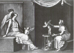 The 1763 La Marchande d'Amours (or La Marchande à la toilette) by Joseph-Marie Vien is a well known example of early French neoclassicism. It is based on an engraving by Carlo Nolli of a painting on the same subject from volume 3 of the Antichità di Ercolano. Vien was open about his borrowing, and invited his audience to compare the two works.[14] The main difference is in the intensity of expression of the three women in Vien's picture, the seller looking at the buyers and the buyers looking at the cupid, compared to the blank expressions and unfocused gazes of the women in Nolli's engraving.[15]