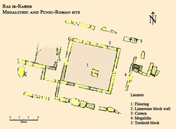 A main point of interest of the remains at Ras ir-Raħeb is the integration of two rough stone megaliths within the Punic-Roman structure. These are the remains of an earlier, prehistoric structure.[27] The only other instance in Malta of the reuse of the remains of a prehistoric building is at Tas-Silġ where the rear-apse of a megalithic temple was included in building of a Punic-Roman sanctuary. These two sites share a number of similarities, such as the position of the courtyard with respect to the rest of the building – leading to the hypothesis that the Ras ir-Raħeb site may have also had a religious meaning.[14] A reassessment of Ptolemy’s descriptions attempted to link this site with a temple to Heracles,[29] but the arguments are not conclusive.[30]