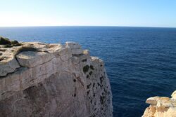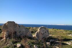 The headland incorporates the ruins of a megalithic temple, as well as Punic-Roman remains.[6] Scholars have been arguing about the function of these remains for decades. Interpretations differ from a domestic villa to a small religious shrine, as well as a major temple dedicated to Heracles.[7] The headland is also a popular diving site, which also includes a cave.[8][9][10] The Ras ir-Raħeb coastline forms part of the Rdum Majjiesa to Ras ir-Raħeb marine protected area, the first marine area to be protected in Malta, in 2005.[11][12][13]