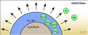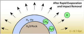 The loss of hydrogen also leads to a depletion of methane in the atmosphere. On ice giants, methane naturally forms a cycle of melting, evaporation, breakdown and subsequent recombination and condensation. But as hydrogen gets depleted, a fraction of the carbon atoms will not be able to recombine with free hydrogen in the atmosphere and over time this will lead to an overall loss of methane. With time, the methane in the atmospheres of hot ice giants will also get depleted.[1]