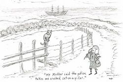 The Goodbye family consisted of undertakers Otis and Pyridine, their daughter Orphie and her pet tarantula Dorian. Orphie was first seen atop the Notre Dame Cathedral with gargoyles, Otis was trying to board a train at customs with a shrunken head, Pyridine was sewing a limb back together in Cardiff, and Dorian was capturing a fairy to eat. Following these illustrations, a cat Ouiji was unveiled and Orphie is said to have a brother named Kepla, but he is hardly ever seen and it is unclear if he even exists."[26]