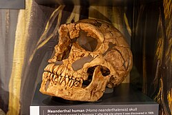 La Ferrassie 1 (LF1) is a male Neanderthal skeleton estimated to be 58–50,000 years old.[1] It was discovered at the La Ferrassie site in France by Louis Capitan and Denis Peyrony in 1909. The skull is the most complete Neanderthal skull ever found.[2] With a cranial capacity of 1641 cm3, it is the second largest hominid skull ever discovered, after Amud 1, another Neanderthal.