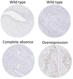 This image shows different patterns of p53 expression in endometrial cancers on chromogenic immunohistochemistry, whereof all except wild-type are variably termed abnormal/aberrant/mutation-type and are strongly predictive of an underlying TP53 mutation:[53]
