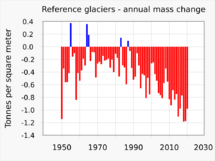 The mass balance, or difference between accumulation and ablation (melting and sublimation), of a glacier is crucial to its survival.[8] Climate change may cause variations in both temperature and snowfall, resulting in changes in mass balance. A glacier with a sustained negative balance loses equilibrium and retreats. A sustained positive balance is also out of equilibrium and will advance to reestablish equilibrium. Currently, nearly all glaciers have a negative mass balance and are retreating.[9]