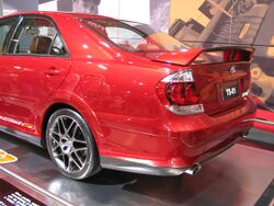 The Camry TS-01 has exterior styling changes which include unique 14 spoke alloy wheels wrapped with Michelin Pilot Sport tires, wheel flares, unique side skirts, a unique front bumper with integrated round fog lights, a unique rear bumper with dual exhaust tips, an F1 inspired rear spoiler with a center mounted rear brake light, modified side door mirrors, and a revised grille and hood.