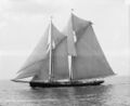 Gaff rigged schooner J. & E. Riggin. Her sails, from left to right, are: jib, staysail, gaff foresail, gaff mainsail, and, above that, a main gaff topsail
