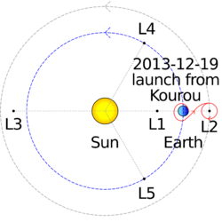 The successor to the Hipparcos mission (operational 1989–1993), Gaia is part of ESA's Horizon 2000+ long-term scientific program. Gaia was launched on 19 December 2013 by Arianespace using a Soyuz ST-B/Fregat-MT rocket flying from Kourou in French Guiana.[20][21] The spacecraft currently operates in a Lissajous orbit around the Sun–Earth L2 Lagrangian point.