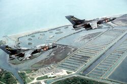 Italian Tornados, along with RAF Tornados, took part in the first Gulf War in 1991. Operation Locusta saw eight Tornado IDS interdictors deployed from Gioia del Colle, Italy, to Al Dhafra, Abu Dhabi, as part of Italy's contribution to the coalition.[170] During the conflict, one aircraft was lost to Iraqi anti-aircraft fire; the pilots ejected safely and were captured by Iraqi forces.[171] A total of 22 Italian Tornados were deployed in the NATO-organised Operation Allied Force over Kosovo in 1999; the A-200s served in the bombing role while the EA-200s patrolled the combat region, acting to suppress enemy anti-aircraft radars,[172] firing 115 AGM-88 HARM missiles.[173]