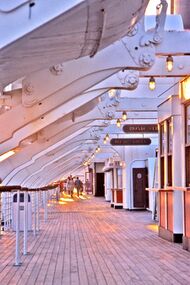 The smaller first-class public rooms, such as the Drawing Room, Library, Lecture Room and the Music Studio, was stripped of most of their fittings and converted to commercial use. This markedly expanded retail space on the ship. Two more shopping malls were built on the Sun Deck in separate spaces previously used for first-class cabins and engineers' quarters.