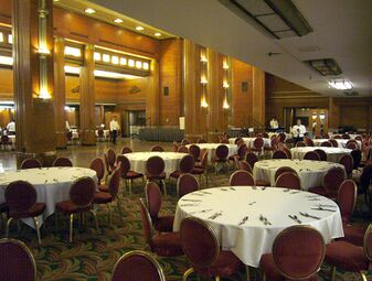 First class dining room, now known as the "Grand Salon". Note the mural above, which had a moving crystal model that tracked the route progress of the Queen Mary and later, when in service, RMS Queen Elizabeth.