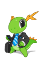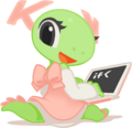 In her former version, Katie was Konqi's girl friend.[8] She is a green dragon wearing a white one-piece dress. She has two fangs, two white horns on top of her head, and fish-fin-shaped spikes on the back of her head. Similar to Konqi, she also has three fingers on each hand and three toes on each foot, all with claws. She wears a gear-shaped pendant and a silver bracelet on her right wrist. Unlike Konqi, she did not have back wings.