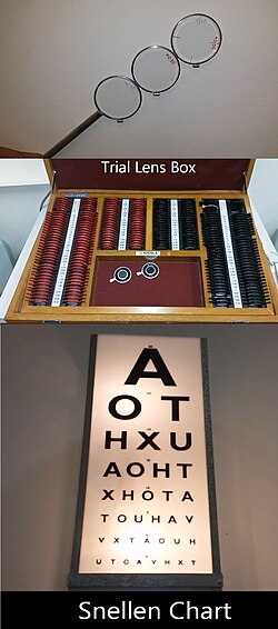 Subjective Refraction is a technique to determine the combination of lenses that will provide the best corrected visual acuity (BCVA).[1] It is a clinical examination used by orthoptists, optometrists and ophthalmologists to determine a patient's need for refractive correction, in the form of glasses or contact lenses. The aim is to improve current unaided vision or vision with current glasses. Glasses must also be comfortable visually. The sharpest final refraction is not always the final script the patient wears comfortably.