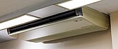 The first mini-split system was sold in 1961 by Toshiba in Japan, and the first wall-mounted mini-split air conditioner was sold in 1968 in Japan by Mitsubishi Electric where small home sizes motivated their development. The Mitsubishi model was the first air conditioner to have a cross-flow fan.[53][54][55] In 1969, the first mini-split air conditioner was sold in the US.[56] Multi-zone ductless systems were invented by Daikin in 1973, and variable refrigerant flow systems (which can be thought of as larger multi-split systems) were also invented by Daikin in 1982. Both were first sold in Japan.[57] Variable refrigerant flow systems when compared with central plant cooling from an air handler, eliminate the need for large cool air ducts, air handlers, and chillers; instead cool refrigerant is transported through much smaller pipes to the indoor units in the spaces to be conditioned, thus allowing for less space above dropped ceilings and a lower structural impact, while also allowing for more individual and independent temperature control of spaces, and the outdoor and indoor units can be spread across the building.[58] Variable refrigerant flow indoor units can also be turned off individually in unused spaces.[citation needed] The lower start-up power of VRF's DC inverter compressors and their inherent DC power requirements also allow VRF solar-powered heat pumps to be run using DC-providing solar panels.