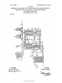 - ↑ Linde, Carl, "Process of producing low temperatures, the liquefaction of gases, and the separation of the constituents of gaseous mixtures", US patent 727650, issued 1903-05-12