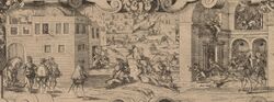 Compounding this bad feeling was the fact that the harvests had been poor and taxes had risen.[8] The rise in food prices and the luxury displayed on the occasion of the royal wedding increased tensions among the common people. A particular point of tension was an open-air cross erected on the site of the house of Philippe de Gastines, a Huguenot who had been executed in 1569. The mob had torn down his house and erected a large wooden cross on a stone base. Under the terms of the peace, and after considerable popular resistance, this had been removed in December 1571 (and re-erected in a cemetery), which had already led to about 50 deaths in riots, as well as mob destruction of property.[9] In the massacres of August, the relatives of the Gastines family were among the first to be killed by the mob.[10]