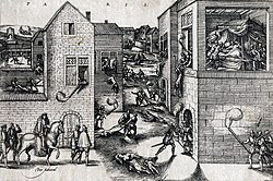 The tension that had been building since the Peace of St. Germain now exploded in a wave of popular violence. The common people began to hunt Protestants throughout the city, including women and children. Chains were used to block streets so that Protestants could not escape from their houses. The bodies of the dead were collected in carts and thrown into the Seine. The massacre in Paris lasted three days despite the king's attempts to stop it. Holt concludes that "while the general massacre might have been prevented, there is no evidence that it was intended by any of the elites at court", listing a number of cases where Catholic courtiers intervened to save individual Protestants who were not in the leadership.[25] Recent research by Jérémie Foa, investigating the prosopography suggests that the massacres were carried by a group of militants who had already made out lists of Protestants deserving extermination, and the mass of the population, whether approving or disapproving, were not directly involved.[26]