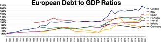 Eurozone member states could have alleviated the imbalances in capital flows and debt accumulation in the South by coordinating national fiscal policies. Germany could have adopted more expansionary fiscal policies (to boost domestic demand and reduce the outflow of capital) and Southern eurozone member states could have adopted more restrictive fiscal policies (to curtail domestic demand and reduce borrowing from the North).[3][4] Per the requirements of the 1992 Maastricht Treaty, governments pledged to limit their deficit spending and debt levels. However, some of the signatories, including Germany and France, failed to stay within the confines of the Maastricht criteria and turned to securitising future government revenues to reduce their debts and/or deficits, sidestepping best practice and ignoring international standards.[12] This allowed the sovereigns to mask their deficit and debt levels through a combination of techniques, including inconsistent accounting, off-balance-sheet transactions, and the use of complex currency and credit derivatives structures.[12] From late 2009 on, after Greece's newly elected, PASOK government stopped masking its true indebtedness and budget deficit, fears of sovereign defaults in certain European states developed in the public, and the government debt of several states was downgraded. The crisis subsequently spread to Ireland and Portugal, while raising concerns about Italy, Spain, and the European banking system, and more fundamental imbalances within the eurozone.[13] The under-reporting was exposed through a revision of the forecast for the 2009 budget deficit from "6–8%" of GDP (no greater than 3% of GDP was a rule of the Maastricht Treaty) to 12.7%, almost immediately after PASOK won the October 2009 Greek national elections. Large upwards revision of budget deficit forecasts due to the international financial crisis were not limited to Greece: for example, in the United States forecast for the 2009 budget deficit was raised from $407 billion projected in the 2009 fiscal year budget, to $1.4 trillion, while in the United Kingdom there was a final forecast more than 4 times higher than the original.[14][15] In Greece, the low ("6–8%") forecast was reported until very late in the year (September 2009), clearly not corresponding to the actual situation.