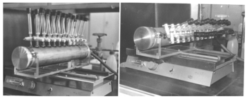 The split and pool synthesis was first applied to prepare peptide libraries on solid support. The synthesis was realized in a home-made manual device shown in the figure. The device has a tube with 20 holes to which reaction vessels could be attached. One end of the tube is linked to a waste container and a water pump. Left shows loading and filtering, right coupling-shaking position. In the early years of combinatorial chemistry, an automatic machine was constructed and commercialized at AdvancedChemTech (Louisville KY USA). All operations of the S&P synthesis are carried automatically under computer control. At present, the Titan 357 automatic synthesizer is available at aapptec (Louisville KY, USA).[6]