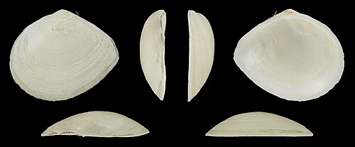 The shells are smooth, relatively flat, oval or somewhat trigonal in shape, and less than 30 mm long.[3] The shell color is polymorphic, varying between individuals and between localities. Often most specimens are white, sometimes most are pink, and also yellow and orange shells may occur. Color is best visible in worn-out dead shells and inside the shell. Concentric growth rings indicating the age of the specimen are often clearly visible.[citation needed]